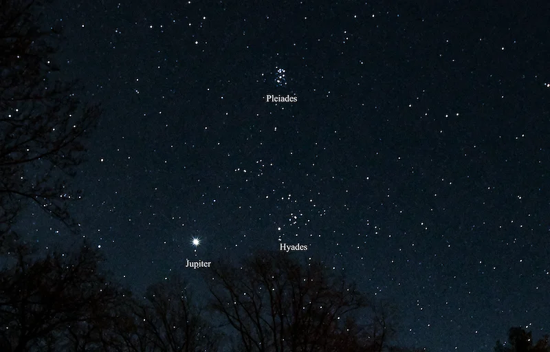 - Las Pléyades aparecen como un pequeño grupo compacto de estrellas azules a la derecha de la “V”.